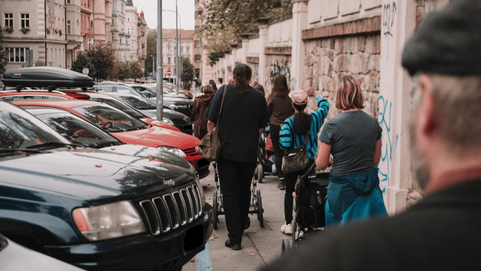 Legalizace parkování na chodnících znepříjemňuje pohyb pěších včetně lidí s kočárky. Brno, ulice Smetanova. Foto: Andrea Špak