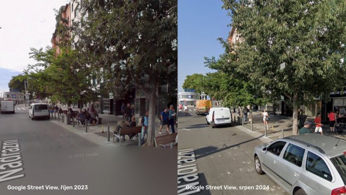 Odstranění laviček, které byly původně instalovány po rekonstrukci, na ulici Nádražní, Brno. Autor: NESEHNUTÍ, koláž z Google Streew View, 2025.